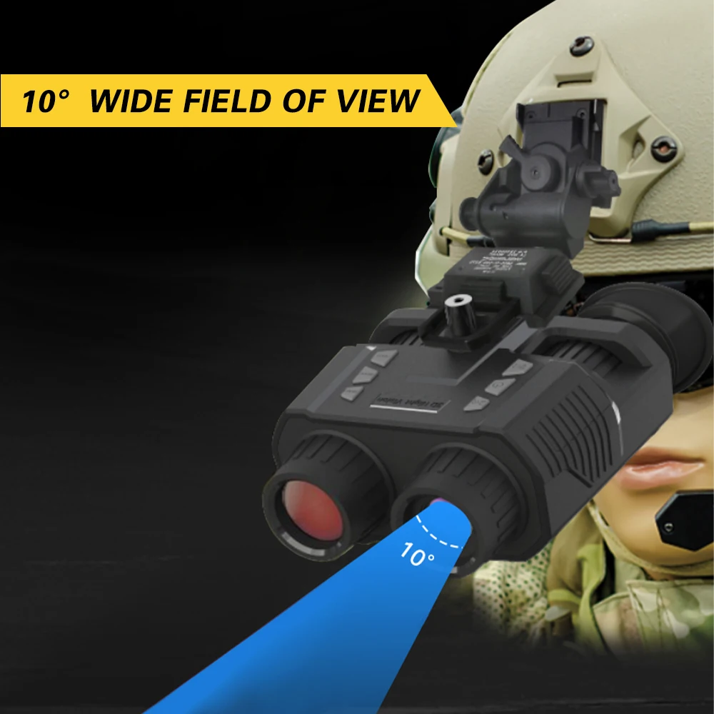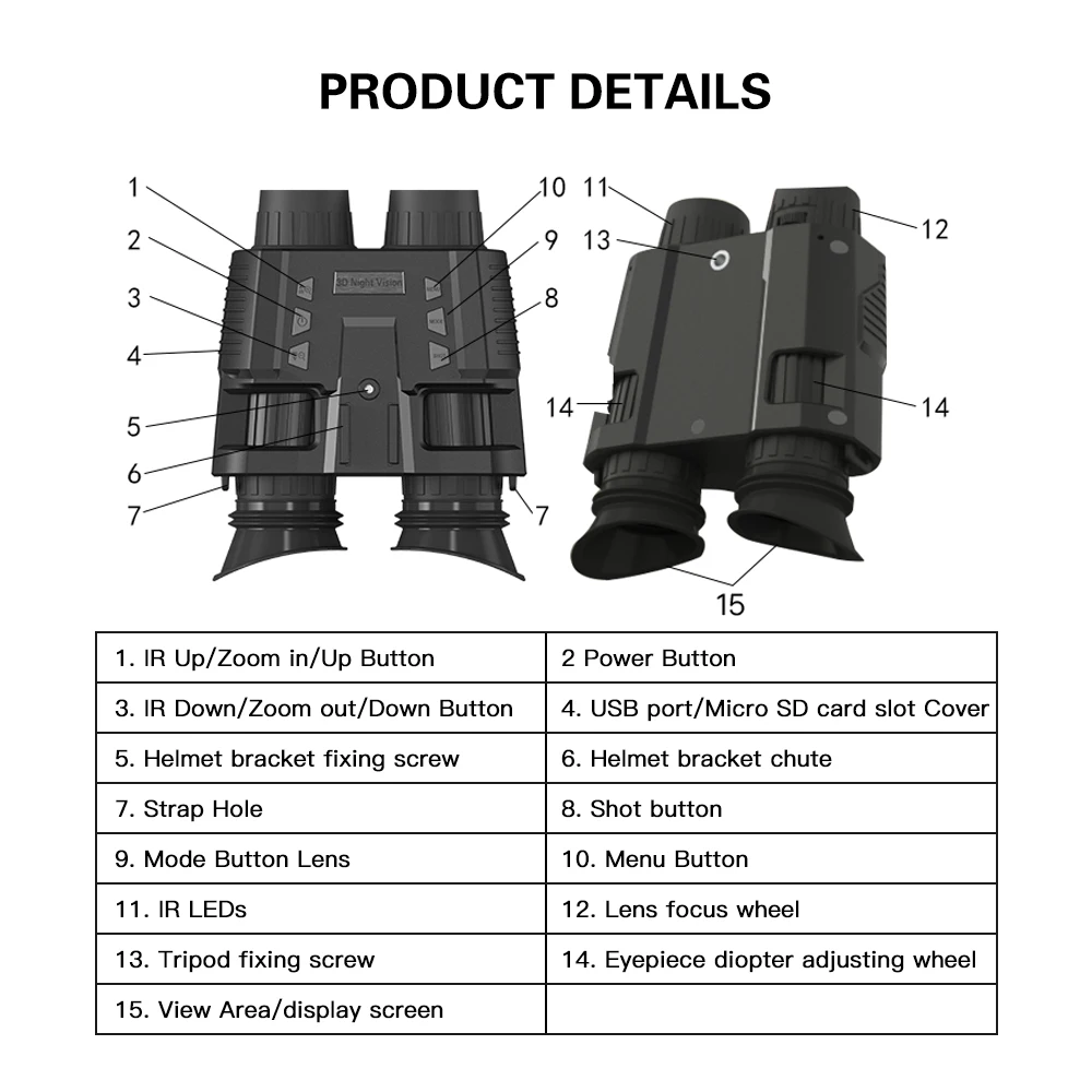 This night vision binocular with 3D display technology can restore the realistic scenes as naked eyes do. It features 7X magnification, 10° wide field of view, and 1.3mp sensor to provide crisp clear images and videos on the 1.4" TFT screen which supports 4x digital zoom and 7-level brightness adjustment. With 850nm IR illuminator, you can see your target 250-300 meters far away instantly. The binocular is IP54 waterproof, lightweight and compact, very convenient for head mount use. It is a great device for cave searching, security, hiking, night fishing, hunting, wildlife watching, etc.